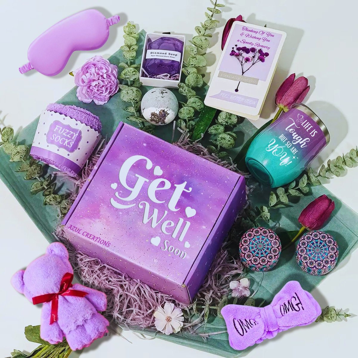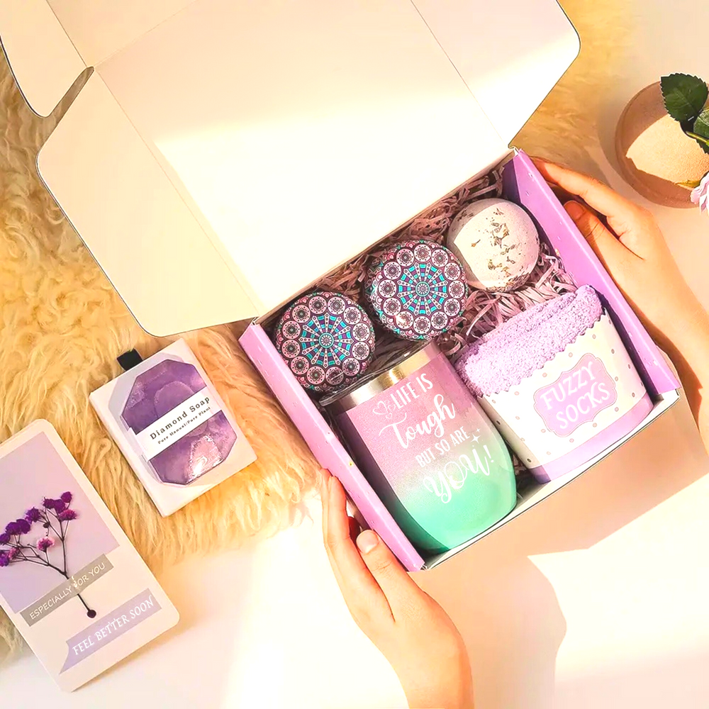 From an exquisite beautiful and durable gift box to an insulated wine tumbler with straw and cleaner, lavender scented candles, bath bomb, soap bar, hand towel, eye mask, fuzzy socks, and a special Get Well Soon gift card. It's a wellness gift that has it all.